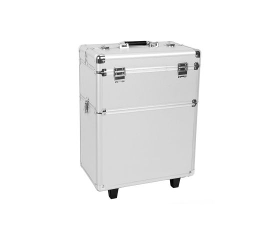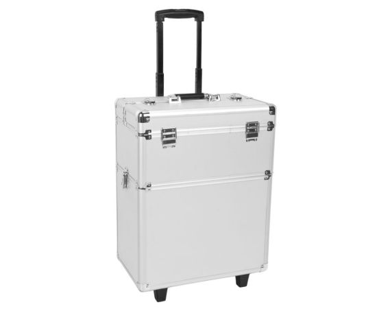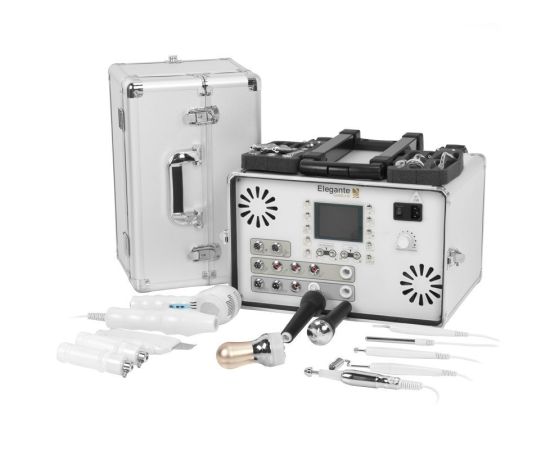 Combina cosmetica multifunctionala cu troller pentru a putea fi transportata cu usurinta. In partea de jos a trollerului se afla dispozitivul, iar in partea se sus (care este detasabila) exista spatiu pentru toate accesoriile.