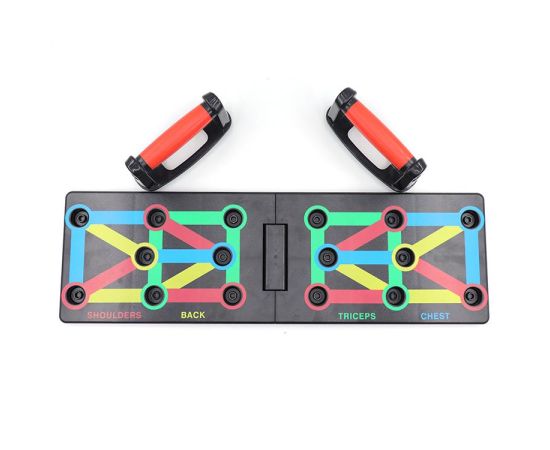 Placa multifunctionala este un dispozitiv de antrenament care presupune combinatii de flotari grupate pe categorii de muschi (biceps, triceps, umeri, spate) pe baza algoritmului de culori.